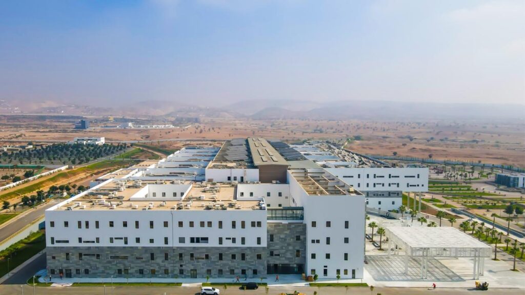 Le CHU Mohammed VI d’Agadir est moderne par son architecture, la qualité des soins qu’il offre, l’intégration des nouvelles technologies de pointe et par son respect des principes de durabilité et d’efficacité énergétique, avec notamment l’installation de panneaux photovoltaïques.